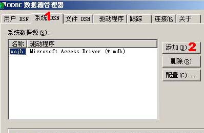 打开 ODBC 数据源管理器后,选择 [系统 DSN](如图步骤1),再选择 [添加](如图步骤2)。如果已经设置过 DSN,则选择 [配置] 进行重新设置。 |