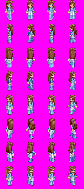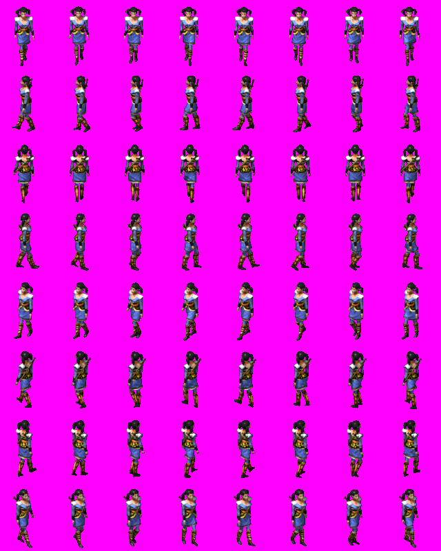 如下图三、四、五。其中图三为四向四帧人物图片,图四为八向四帧人物图片,图五为八向八帧图片。帧数越多,图片的显示效果将越好(当然文件也越大)