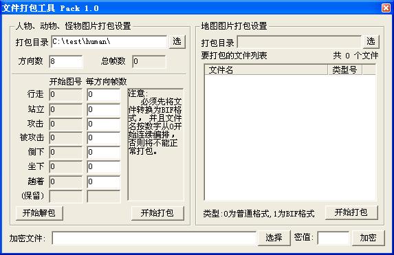 4、运行打包程序,选择要打包的目录(如附图左边部分),设置好方向数、各动作的图片帧数后按“开始打包”按钮即生成图像包文件。(生成后将在原来的目录下生成一个INI文件,用于记录设置的值,以备下次使用)